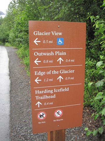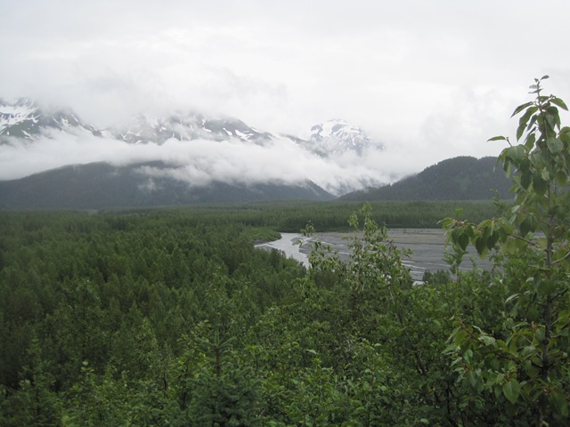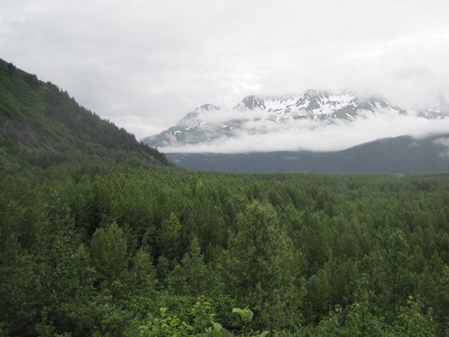 We spent the night at our newest favorite camp spot at Hidden Lake. The spot we had before was taken, but we camped across the road. Thankfully there was a pavilion close to our campsite for Scott to cook breakfast in. He had to take the tent down in the rain though. Quite humorously we listened to the country song “Rain is a Good Thing” as we cruised out towards some partial sun and back to Highway Number One or the Sterling Highway.