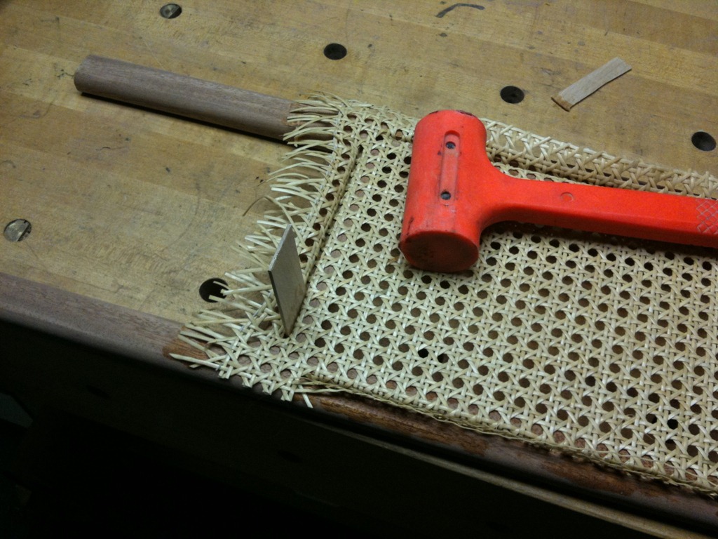 Before installing the cane, the reed spline and cane were soaked in warm water for 20 minutes. After blotting the cane dry, I used a 1/6” thick x 3” long x 1” wide piece of scrape maple (round the end a bit) and a dead-blow hammer to press the cane into the groove. This process was a bit scary at first because I was worried about cutting through, but it really wasn’t as difficult as it would seem.