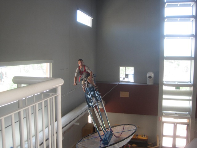 The first order of business was the aerial bike ride. Scott first did this in St. Louis with Ed and Kayla a few years back. There are signs that state that you should keep the bike upright, but Scott put on quite a show for the museum visitors a story below.