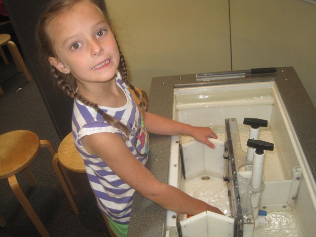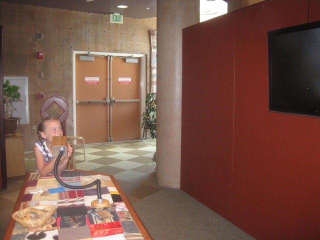 It is hard to tell, but Scott is sporting his new rear-view mirror for biking on his sunglasses while we were picnicking in the park. We had a fellow paddler come and mention his awe of our van setup while we were eating. He also mentioned his worry for the security of the things on the van. When Scott and I traveled the country in from 97’ to 98’ we had the entire roof rack complete with a full clam shell and two bikes ripped right off the van. Everything was cabled together, so instead of wasting time unraveling everything someone just took the entire Yakima rack. Consequently Scott has been more of the attitude that if someone wants something badly enough they will find a way to get it. However, after the friendly advice and chat about paddling Scott did string a cable though everything. Cody was jumping at a chance to get back into the museum. We headed back to the water table and spent a REALLY long time diverting water and creating dams. They were very serious about their work. When I noticed Brooke taking over the entire table for too long I pulled her over to another water exhibit that incorporated air pressure. It took her quite some time to discover how to make it work, but she was very official and excited to explain her discoveries and the connection with transporting water in cities with air pressure.