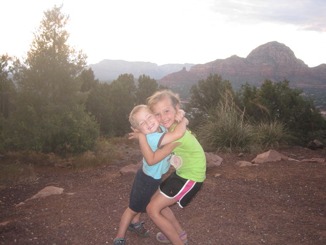 The picture on the left doesn’t seem that special except for the canyons in the background. However, only five minutes later Brooke was tired of getting bumped with the shovel and Cody was tired of Brooke being in his way. Any guesses on how it ended? Cody picked up the first fistful of sand and he strategically targeted Brooke’s face and down her back into her shorts. As Brooke spit out the sand in her agape mouth she picked up several fistfuls of sand and blasted Cody until he went running. I let them have their time outs with sand in their mouths. I am one mean momma. The picture on the right is important for two reasons. First, it shows the ingenious covering over the playground providing some much needed shade. We have never seen that before at a playground. It also shows Cody being super brave climbing something he was too afraid to attempt two minutes before.