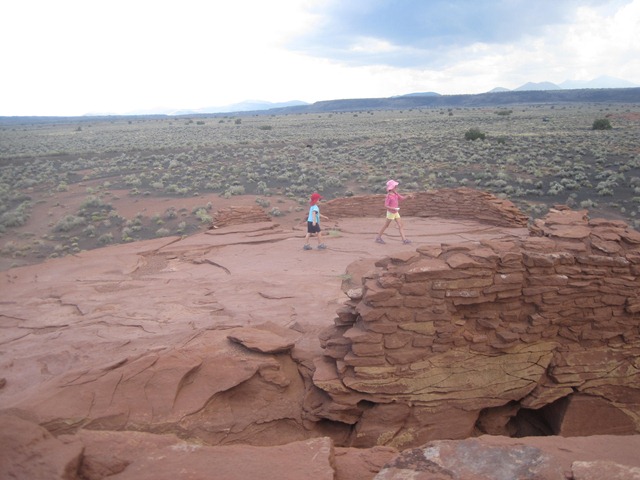 Junior Ranger Badge Number Two for today – Wupatki. The last question the kids were asked by the ranger, “if you were to leave your home and travel far away what would you take along?” (Funny they didn’t know we actually were in the process of said question.) This tied to the fact that the people who lived here packed up and moved away about 800 years ago. The kids had to first draw their answer in their book and then explain it to the ranger. Brooke drew a tepee and a clay pot. Cody first wanted to draw a squirrel. I explained that the squirrel might not want to come along. I let Cody think on his own, with no prompting from me, honestly. Then he drew a cross. The ranger was a little taken aback by the cross. She said, “Stick with your sister. You’ll have shelter and food to eat.” Scott very seriously chimed in with, “Well, at least Cody will have the Lord.” I almost died laughing right there. As I might have mentioned Scott is not very religious, so for him to say something like that perfectly seriously to the rangers was just too much. Brooke and I parted ways with Scott and Cody after the badge ceremony so I could take Brooke to the bathroom. I laughed all the way into the bathroom and back to the car. Brooke couldn’t figure out what was so funny. Scott knew. “Did you like that?” he asked when I got back to the car.