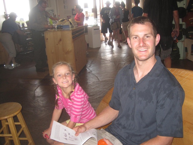 In order to complete the Junior Ranger badge the kids had to go for a hike and find some items. It was raining pretty hard so Scott took Brooke out just long enough to snap some pictures. Notice his wet shirt. Then Brooke begged to go back out, and since it was a warm enough rain I went. Although we still couldn’t spy the petroglyph we were supposed to find. Although that may have had something to do with us running between the raindrops. Thankfully the ranger showed us a picture from a book.