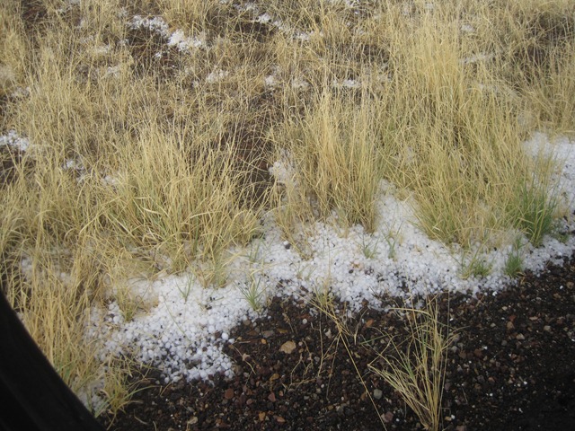 Leaving Wupatki the rains brought in the smell of the charred grasslands. Not far down the road we encountered hail on the ground.