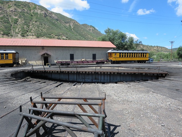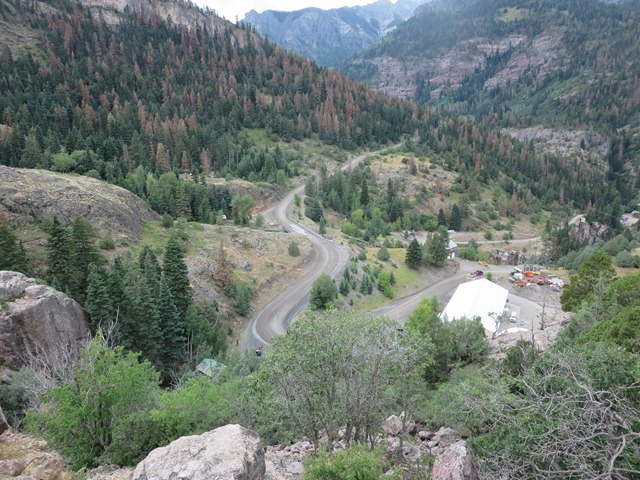 When we finally got back on 550 we stopped for a moment at Coal Bank Pass Summit at 10,660 feet with a view of the San Juan Mountains. The roadside sign called this stretch of road the San Juan Skyway or Scenic Byway. We arrived in Silverton, despite the long accident detour, just as the Durango-Silverton train was leaving town.
