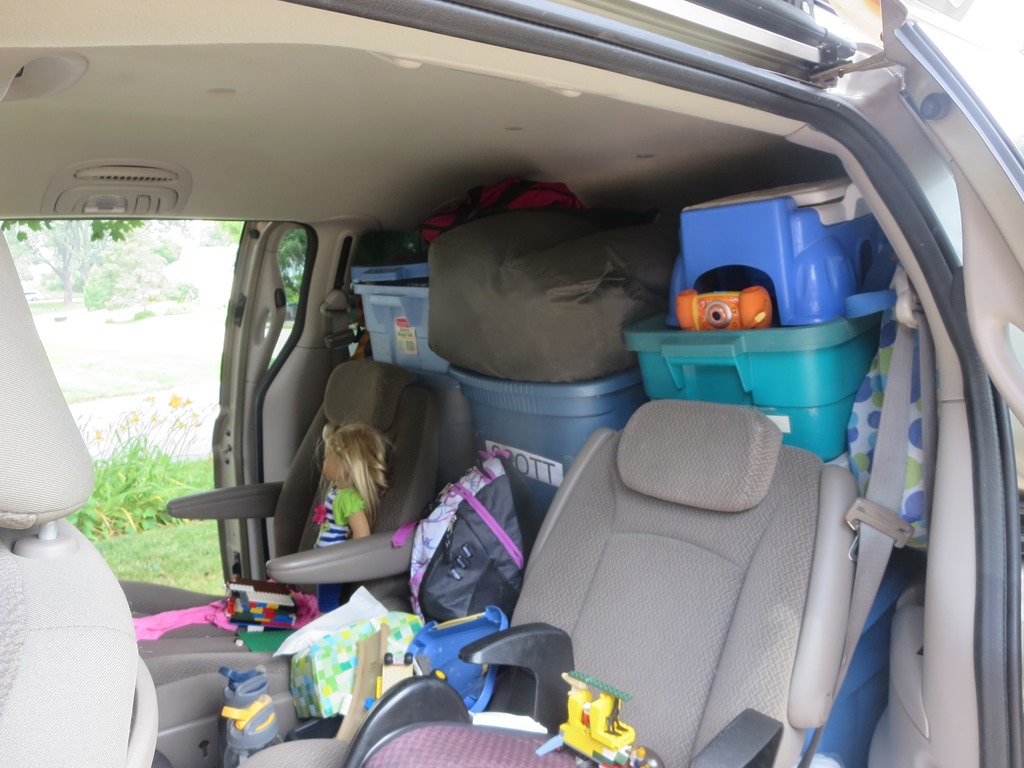 Scott has been practice packing for at least a month. It paid off. There isn’t a whole lot of extra space in the van. We have a half-sized bin for each of our clothing, a water jug crate, Scott’s Chuck box or mini-kitchen. a 5 gallon bucket (our washing machine), a bin for biking helmets and clothing, a bin for paddling gear, a layers bin, two food bins, a half bin for camping miscellaneous items, the ancient Coleman stove, three bags for beach towels and shower towels, the tent, Camelback’s (water backpacks), a large tool box, and two duffel bags of our sleeping bags, mats, pillows, and bedtime clothing. In the wells where our seats normally stow we have camp chairs, two mini-shovels, the legs to the table on the roof, a gallon of camp fuel, and a soccer ball. In the side wells for the seats are the climbing gear, Dutch oven, jumper cables, and a smaller tool box.