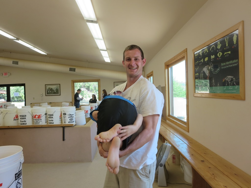 This is Sinbad, a fiberglass reproduction of a Columbian mammoth skeleton. The kids took part in the Junior Paleontologist Excavation Program. Since digging is one of their favorite past times, this was a perfect program for them. Our guide worked really well with the kids. Cody had a lot of the answers to his questions. Watching the kids was hysterical though. Brooke wanted to work independently and not as a team with her partner. Although after Brooke uncovered a tusk and a toe bone in record time she decided to help her younger partner uncover a giant bear skull and thigh bone. Cody was happy digging away savoring the process, and then he decided he had more fun helping his partner uncover her discover of a tooth. Then she helped him uncover a giant jaw. Cody seems to have much more fun helping others and Brooke seems to want to be the first with the most.