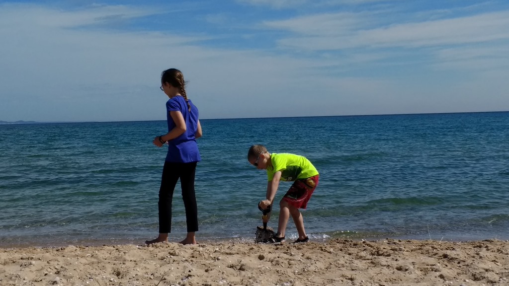 We tried to get a picture of Brooke on the boardwalk. I even hopped out of the spot where she was hiding behind me, but it didn’t work out as well as we hoped. Cody set to work right away on his favorite tasks, digging and collecting rocks. The beach was more rock than sand so he was sure to be occupied for days.
