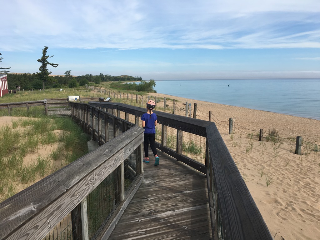 First on the agenda was a bike ride to explore the highlights of Sleeping Bear National Lakeshore. Most of the park didn’t open until eleven, so we had to bike by the sites and photograph from the outside. The early morning fog was still looming over the lake. The calm of the lake in the morning sharply contrasted the stormy waves the lake had last night.