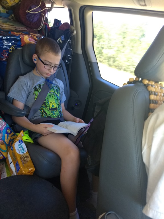 We headed out on the road to stop at the store and move to Well State Park. I had reserved a site on-line, but it wasn’t the best site. Three years ago it would have been perfect for the kids since it was five feet from a park, but these days I can’t even drag my kids to a park. So, Scott found us a new site more hidden in the trees. See if you can find Brooke hidden behind her book and under every possible snack we could grab from the store.